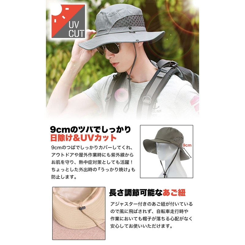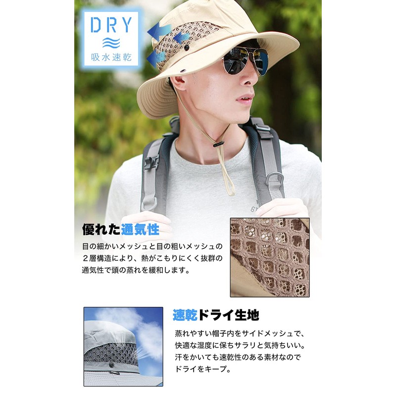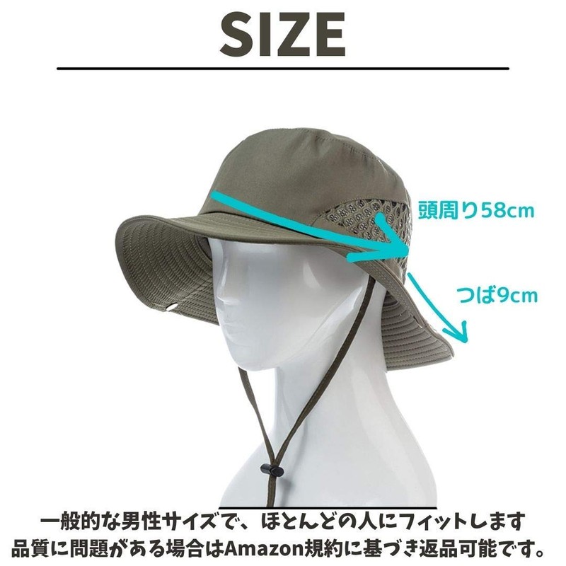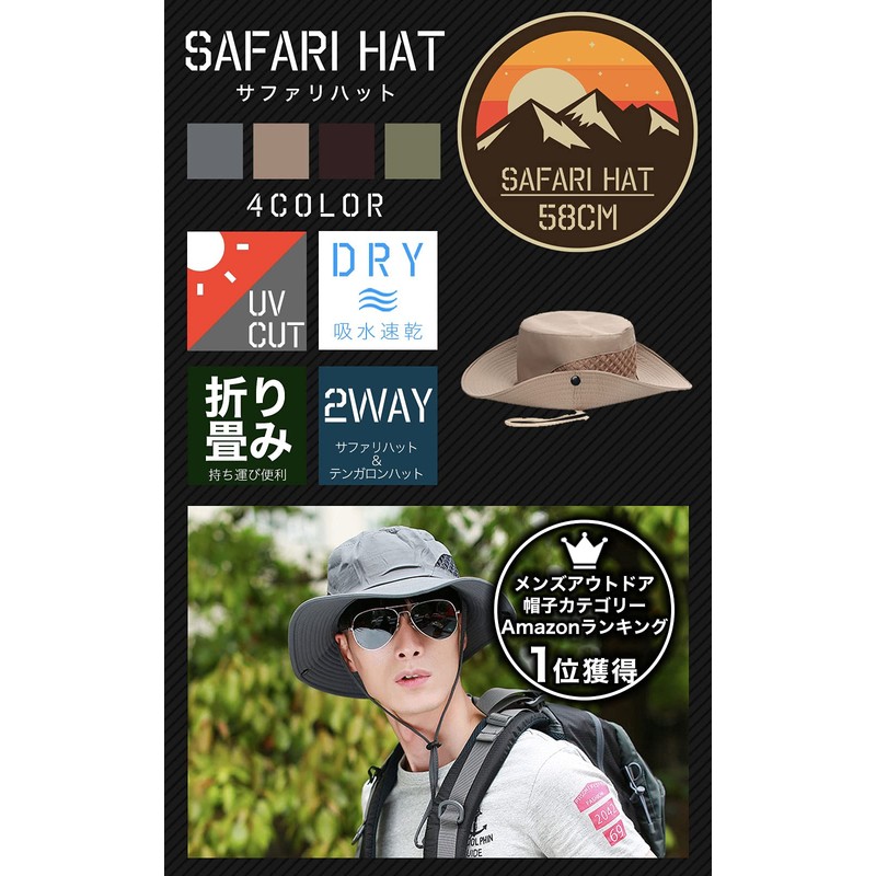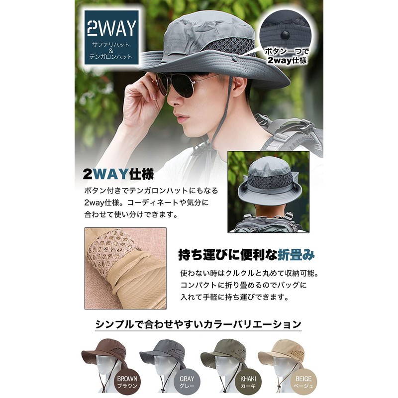 - Mesh type for excellent breathability: This safari hat is made of nylon and is mesh-type, with excellent breathability. The brim is large 22.8 inches (58 cm) in size, so it has a very high sun effect and is great for summer and autumn. This 2-way hat comes with a neck tie that won't blow away in the wind and can be changed to a ten-gallon hat