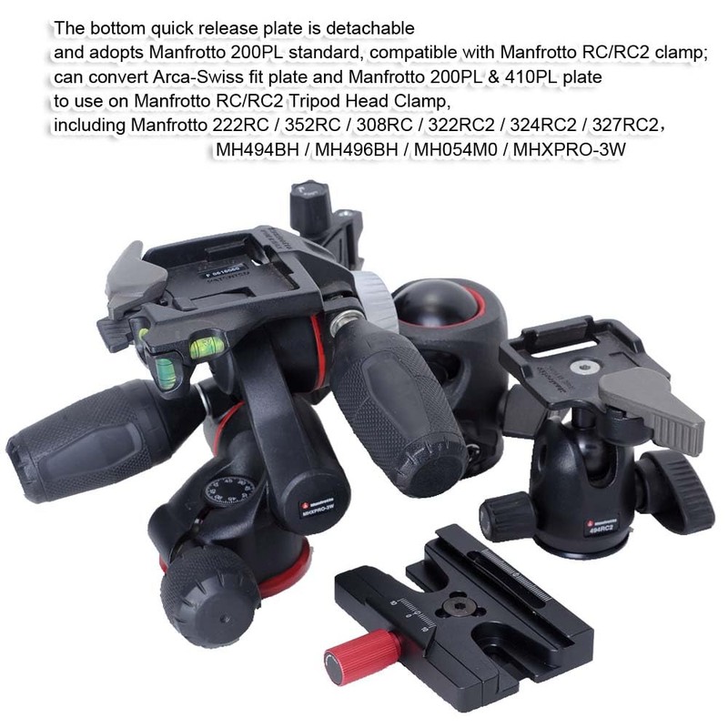 3. The bottom quick release plate is detachable and adopts Manfrotto 200PL standard, suitable for Manfrotto RC/RC2 clamp; the converter is suitable for Converting Arca-Swiss Quick Release Plate to use on Manfrotto RC/RC2 Tripod Head Clamp;