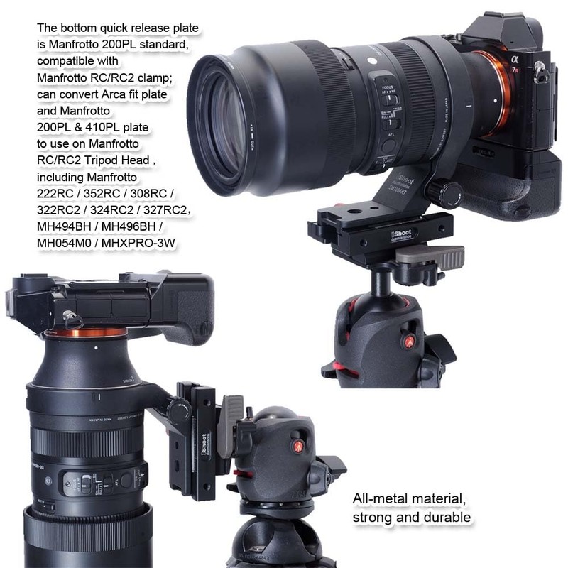 • 3. The bottom quick release plate is detachable and adopts Manfrotto 200PL standard, suitable for Manfrotto RC/RC2 clamp; the converter is suitable for Converting Arca-Swiss Quick Release Plate to use on Manfrotto RC/RC2 Tripod Head Clamp;