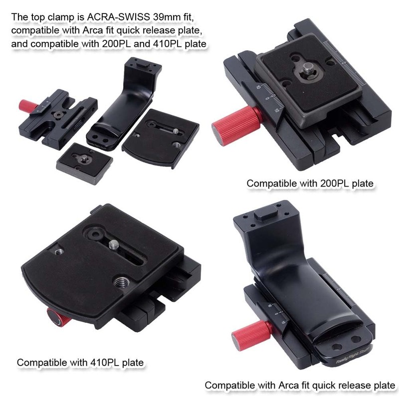• 2. The top clamp adopts ACRA-SWISS / RRS 39mm standard, compatible with quick release plates of Arca fit; and compatible with Manfrotto 200PL and 410PL quick release plates as well. The clamp base knob is designed with an extra-long design, about 48mm long; with a spirit level, a compass and laser scale;