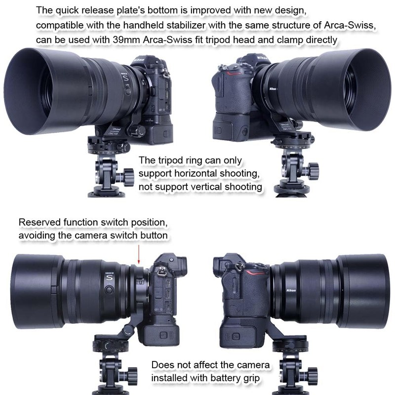 - 1. The tripod mount ring is tailor-made according to the shape and structure of the lens. The inner wall of the tripod ring has a concave-convex irregular structure, only compatible with Nikon Nikkor Z MC 105mm F2.8 VR S, Z 85mm F1.2 S and Z 135mm F1.8 S Plena Lens, cannot be used for other lenses, and function button holes are reserved;