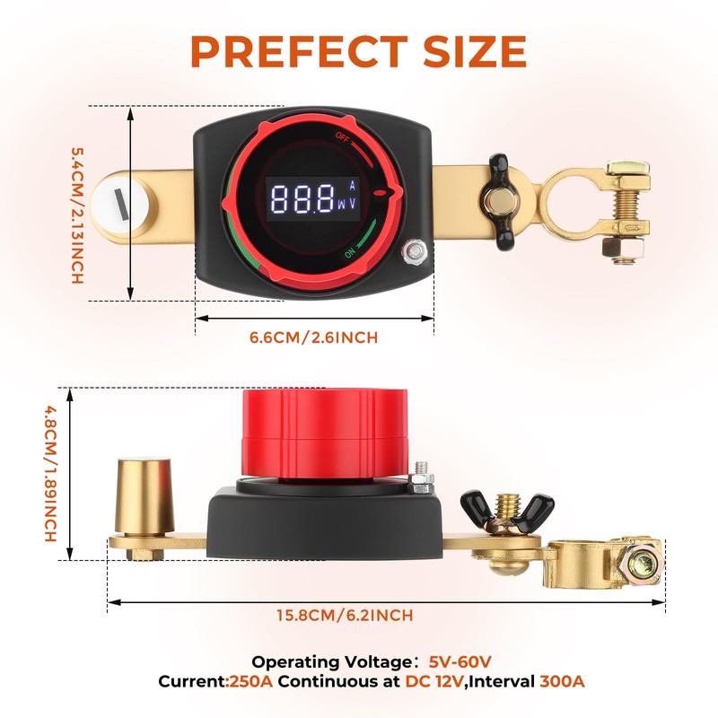 - 【LED Voltage Display】Equipped with a large-screen LED digital voltage display, this power cut-off switch shows the current voltage in real time when turned on, helping you easily monitor battery status. When switched off, the display remains blank. The LED screen prevents scratches and offers clearer, easier-to-read voltage data.