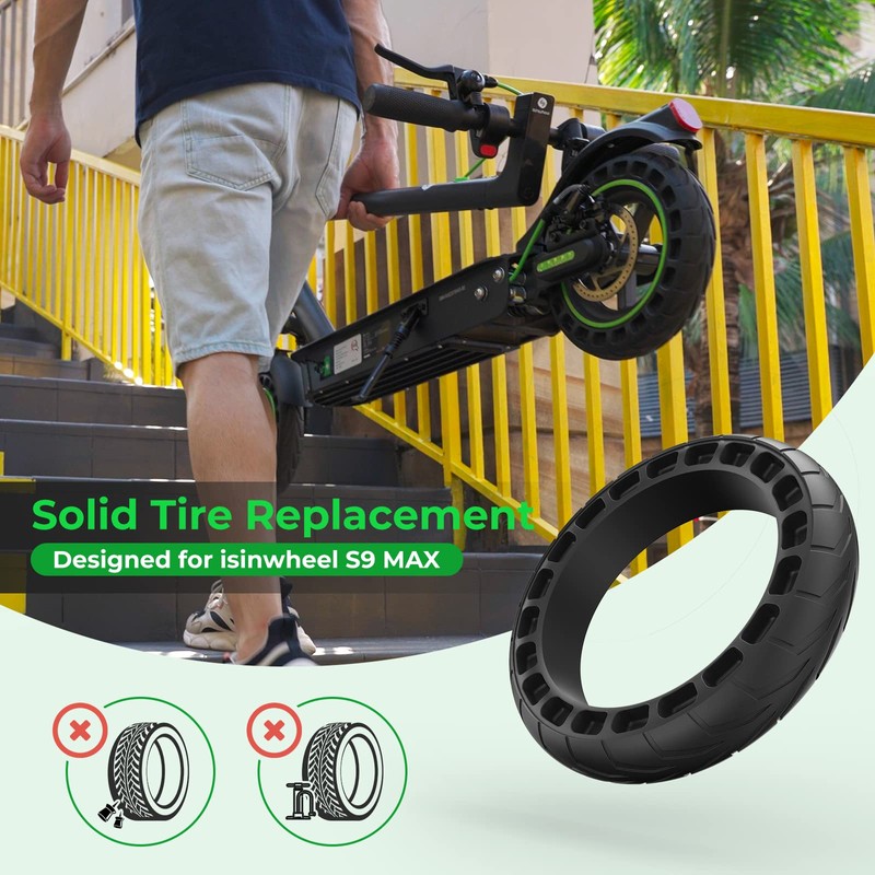 - 【10 Inch Tire】Maximum load: 220lbs, the solid tire Compatible for isinwheel S9Max Electric Scooter. Original tire replacement for electric scooter rear wheel. Please see pictures to confirm size and compatibility before order.