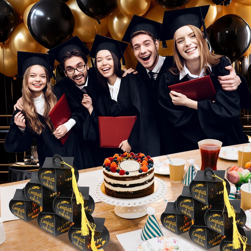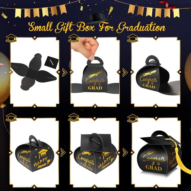 - Cap Design: Graduation gift boxes are designed with adorable graduation caps, and match a tassel for each box which can be tied to the handle hole. 2024 graduation decorations also combined with “Congrats Grad” and great gold foil patterns: graduation cap, cup, and stars, easy to create a graduation atmosphere.