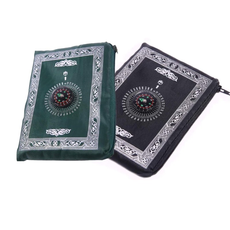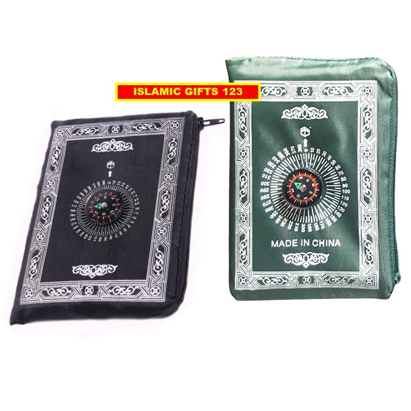 - 🔴Portable travel prayer mat with 4 colors: Black, Green, Blue, and Burgandy Zipper pouch with a compass attached.