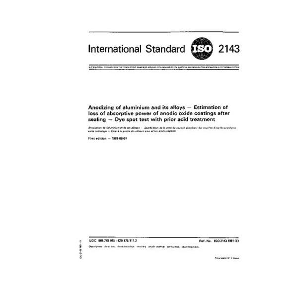ISO 2143:1981, Anodizing of aluminium and its alloys - Estimation of loss of absorptive power of anodic oxide coatings after sealing - Dye spot test with prior acid treatment