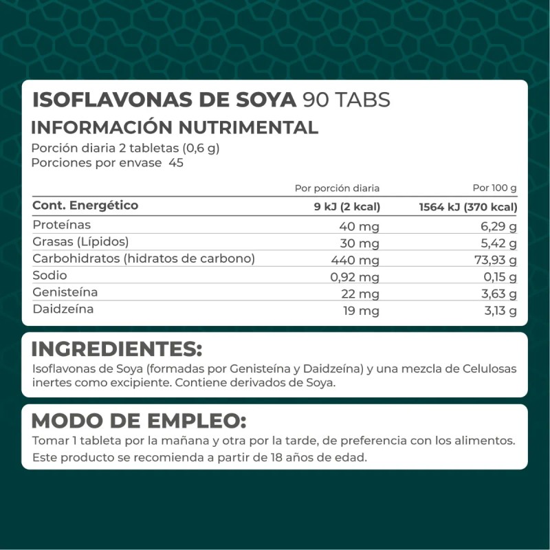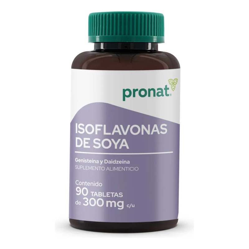 - Tienda oficial Pronat Envío Inmediato Full (Mercado Envío) Compra protegida (Mercado Pago) INGREDIENTES Isoflavonas de soya y una mezcla de celulosas inertes como excipiente. PRONAT ISOFLAVONAS DE SOYA, SUPLEMENTO ALIMENTICIO CON GENISTEÍNA, DAIDZEÍNA Y MEZCLA DE CELULOSAS, 90 TABLETAS DE 300 MG 90 tabletas de isoflavonas de soya formadas por genisteína y daidzeína. INGREDIENTES DESTACADOS Contiene 22 mg de genisteína y 19 mg de daidzeína por porción y una mezcla de celulosas inertes como excipiente. BIENESTAR SIMPLE Entendemos que llevar una vida sana puede ser complicado, por eso tenemos un portafolio enfocado en cada una de tus necesidades, simplificando tus elecciones. Te invitamos a averiguar sobre los beneficios de las isoflavonas para la mujer. MODO DE USO Se sugiere tomar una tableta por la mañana y otra por la tarde de preferencia con los alimentos. Este producto se recomienda a partir de los 18 años de edad y puede ser un buen aliado para mujeres a partir de la menopausia. Este producto no es un medicamento. El consumo de este producto es responsabilidad de quien lo recomienda y de quien lo usa. Aviso legal
