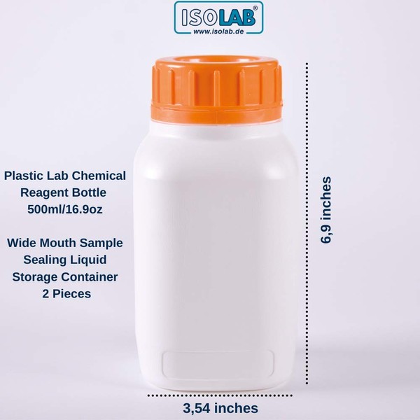ISOLAB Set of 2 Plastic Laboratory Bottles (HDPE), 500 ml (16.9 oz), Wide Mouth, for Sample Storage, Storage of Liquids, etc.