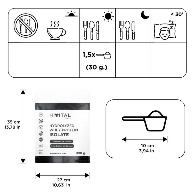 The best isolate whey: each 30 gram serving of the powder contains 26 grams of pure protein, of which 26 g (100%) comes from natural hydrolyzed whey protein isolate. No added sugar. Contains lactose. Dosage: Take 30 g per day, equivalent to one and a half scoops (included inside), dissolved in 250 ml of water.