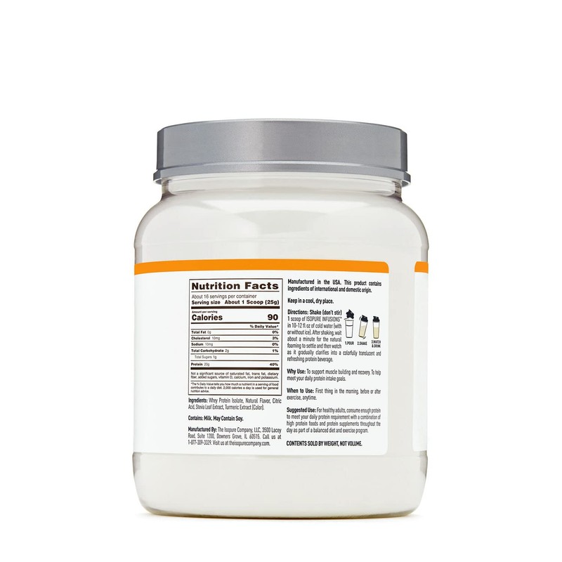 Add less and do more with Isopure 100% Pure Whey Isolate Protein Powder Infusions — a naturally flavored Isopure protein powder designed to be gluten free and lactose free. The protein powder is ultra hydrolyzed to easily mix into a colorful, translucent beverage that drinks like protein water. Experience a thirst-quenching fruity burst of citrus lemonade flavor with each sip of your new favorite protein drink mix. Formulated with five simple ingredients and zero added sugar, this great-tasting protein shake helps meet your daily protein intake goals and aids overall wellness. Just mix one 25-gram scoop of this 100% clear whey isolate with 10-16 fl oz of cold water, and wait about a minute after shaking for the natural foaming to settle. Use it first thing in the morning, before or after exercise, or anytime you want a protein supplement boost. This clear whey protein isolate helps support muscle health and is a great choice for post workout recovery. It works best in combination with high protein foods and protein supplements as part of a balanced diet and exercise program. Add Less. Do More.