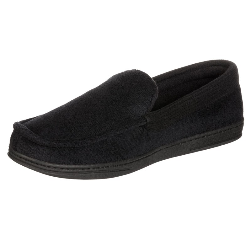 isotoner Men's Microterry and Waffle Travis Moccasin Slippers with Memory Foam Insole and Durable Rubber Outsole, Black, 13-14
