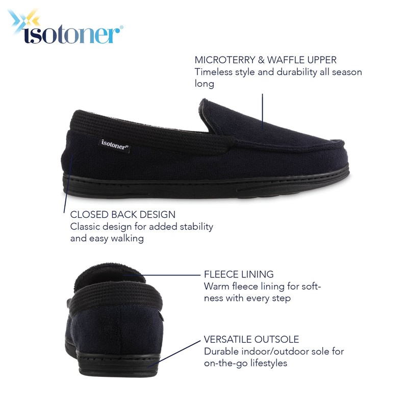 isotoner Men's Microterry and Waffle Travis Moccasin Slippers with Memory Foam Insole and Durable Rubber Outsole, Navy Blue, 9.5-10.5