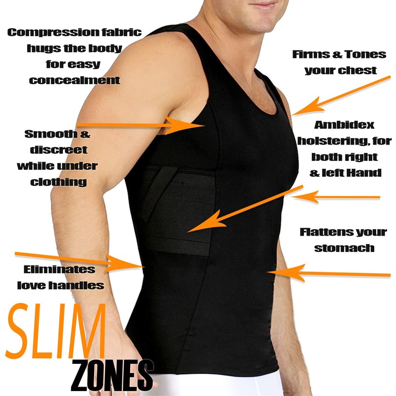 - ADDITIONAL INFORMATION: The conceal carry holster hugs the body which provides a more seamless look while under clothing. This concealment compression garment is designed to compress target areas (depending on style of garment) to provide back support and slimming body shaper support in the love handles and beer belly areas. The fit should be snug to maximize garment effectiveness. 100% of all our products are MADE IN AMERICA RIGHT HERE IN THE UNITED STATES!