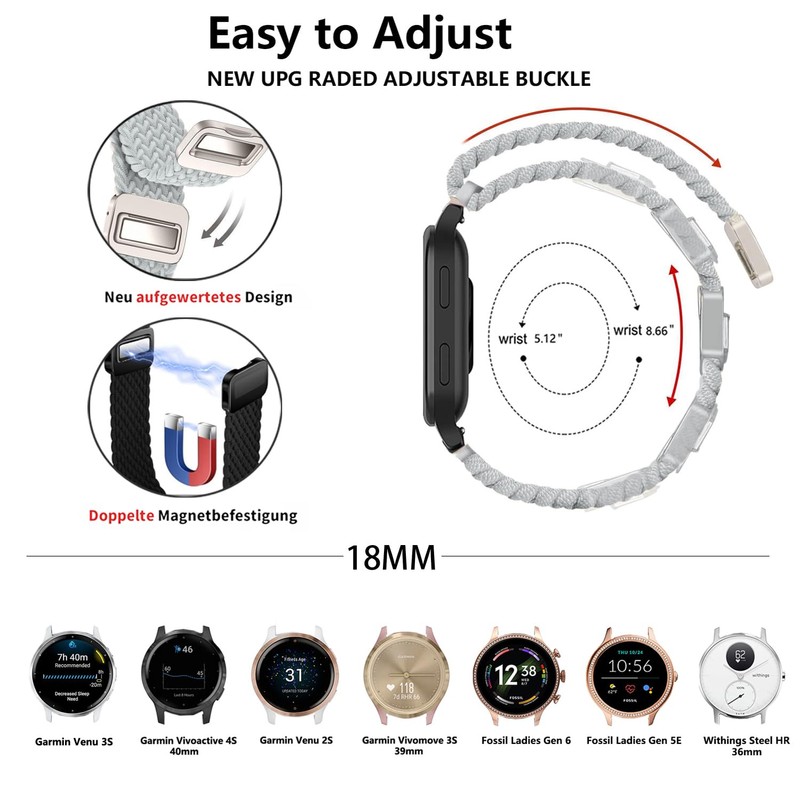 - 【New Upgrade Magnetic Clasp】 - 3nd Generation new upgrade adjustable Garmin Venu 2s magnetic clasp,Easy Wear and maintain perfect fit 5.12 inches - 8.66 inches. One size fits most, no need to measure your wrist to choose a size like traditional braided bands.