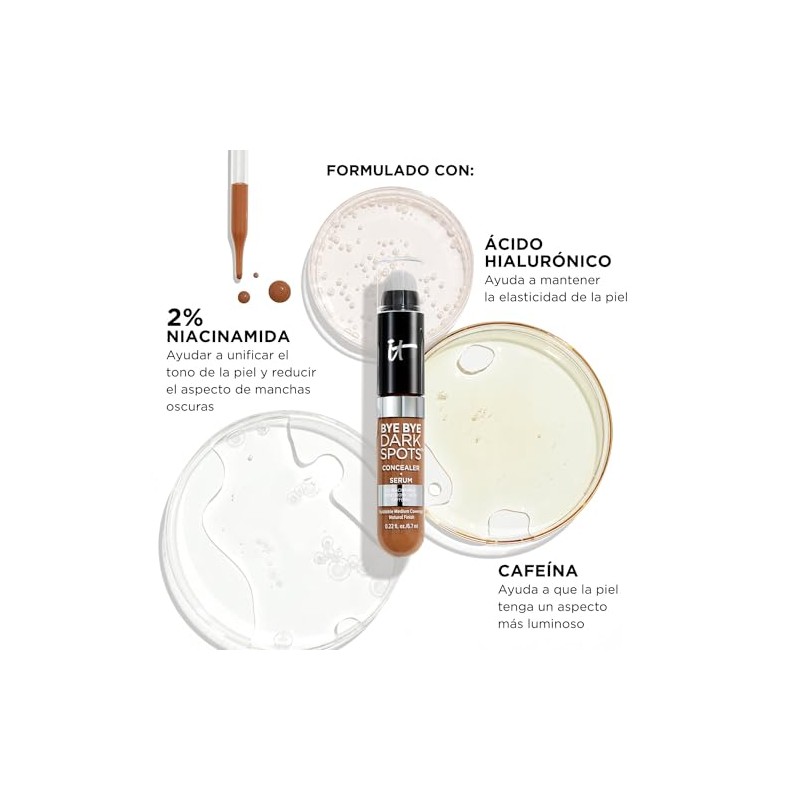 🌟 💄 It Cosmetics Bye Bye Dark Spots Concealer, Corrector de Ojeras + Suero Multiuso, 2% de Niacinamida, Ácido Hialurónico y Cafeína, Acabado Natural 💄 🌟