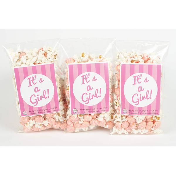 It's a Girl! Baby Shower Popcorn Bags. 20 packages of Gourmet White & Baby Pink Popcorn Mix. Each Package weighs 2.5 oz. and holds 2 cups of popcorn. Great for Baby Showers!