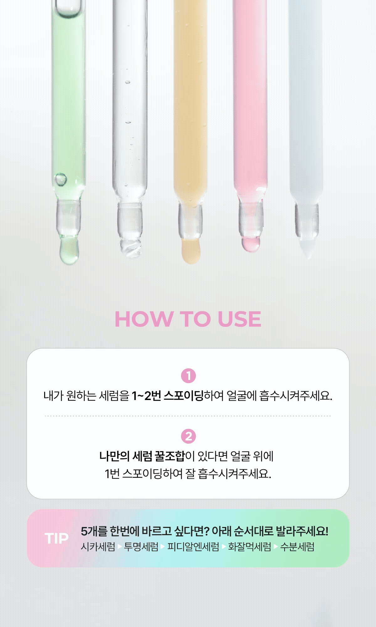 1. Take 1–2 drops of the serum and absorb into your face. 2. If you have a synergic product with the serum, apply one drop of it and then absorb. *If you want to apply all of the 5 products, follow the order as provided. Cica Serum > Clear Serum > PDRN Serum > Firming Serum > Moisturizing Serum