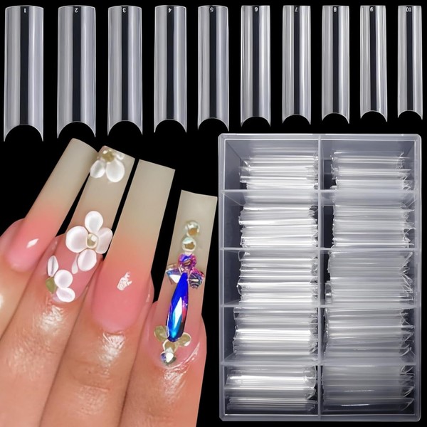 ITADAKU 200 PCS Extra Long Clear Nail Tips - No C Curve, 10 Sizes, Half Cover Straight Tapered Square French Tips for Acrylic Nails, Professional and Home Use, with Box