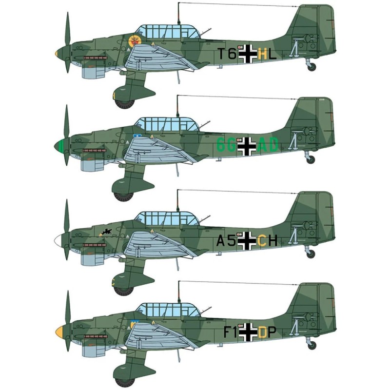 The Junkers Ju 87 Stuka was a two-seat dive-bomber/ground-attack aircraft. The Stuka first flew in 1935 and made its combat debut in 1936 as part of the Condor Legion during the Spanish Civil War . The aircraft was easily recognizable by its inverted gull wings and fixed landing gears. The Stuka's design included several innovative features including automatic pull-up dive brakes under both wings to ensure that the plane recovered from its attack dive even if the pilot blacked out from the acceleration. It became soon the icon of the German Blitzkrieg during the first stages of the Second World War providing the air support to the Wehrmacht Panzer Divisions. It was used by Luftwaffe during the Battle of Britain where it shown its weaknesses compared to the faster and well-armed modern fighters as Hurricane and Spitfire.
