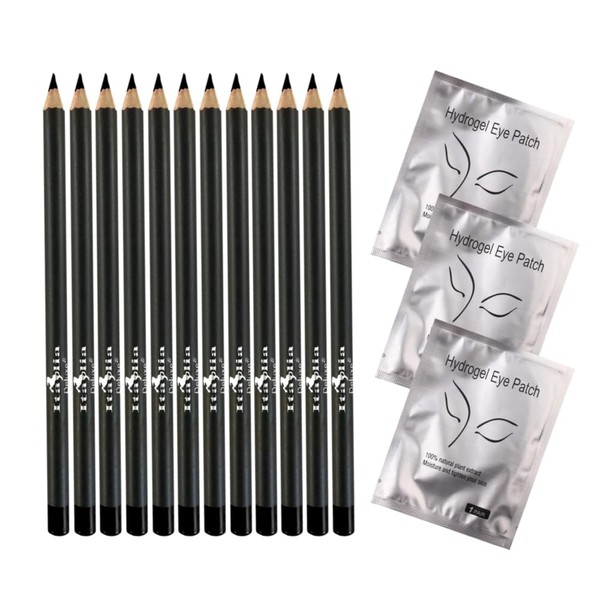 Italia Deluxe 12 pcs Eyeliner Pencil, Ultra Fine, Creamy, High-pigmented, Long-lasting + 3 pair Hydrogel Eye Patch for Lash Extensions (Black)