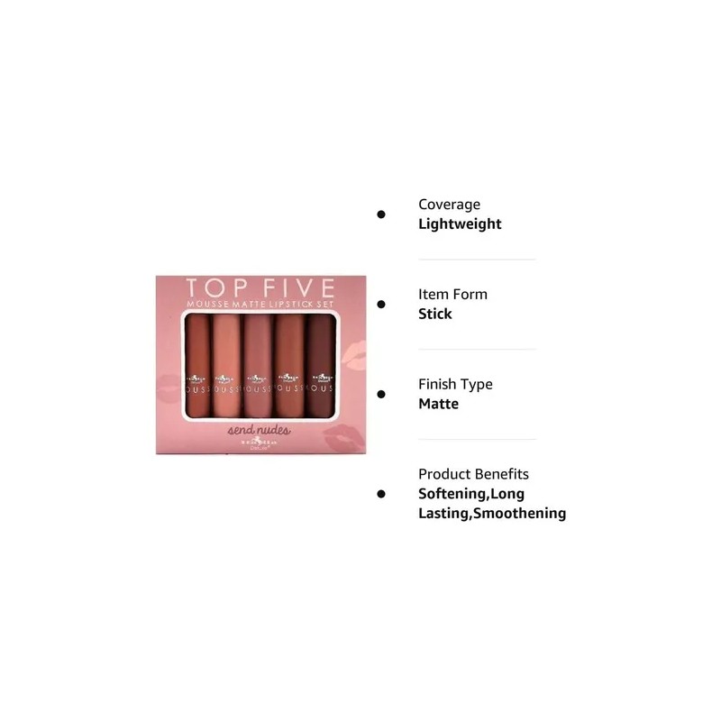 No pierdas la oportunidad de lucir unos labios irresistibles con los labiales mate Top Five Mousse Italia. ¡Atrévete a destacar tu belleza con este set de labiales de alta calidad!