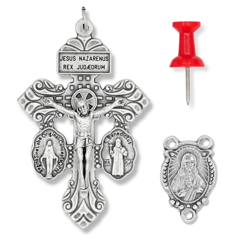 Italian Rosary Making Kit for 5 Rosaries - Cross and Center Sets with 2” Pardon Crucifix with Sacramental Medals (Miraculous Medal and St Benedict Medal) and 1” Holy Family Rosary Center