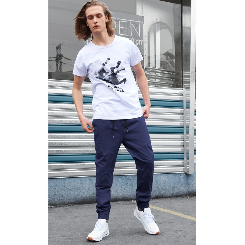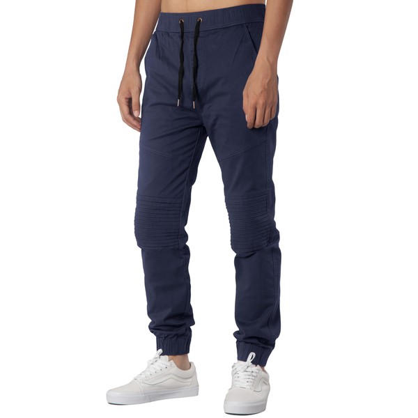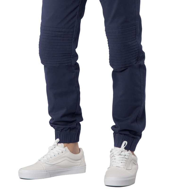 - Men’s biker jogger casual pants made their place in fashion as they are comfortable and trendy. We made it with the pleated knees,making them more popular,especially in the street style.Slim and tapered fit; Size from XS to 2XL; Fit for everyone and athletic build; Our model is 6”; 154 Ibs; he wears size Medium; this sport pants are great choice for son,dad,husband,lover and yourself.