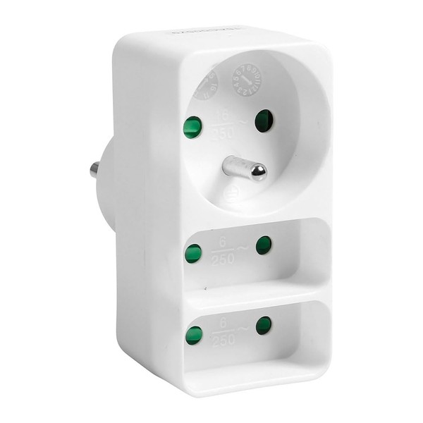 • This triple plug has 3 sockets (2 x 6A and 1 x 16A) and allows you to connect 3 devices. It is white and allows you to connect multiple devices without the need for multiple extension cables. It is convenient for connecting all kinds of electrical appliances and lights. It is a practical and functional accessory that allows you to meet your power connection requirements.