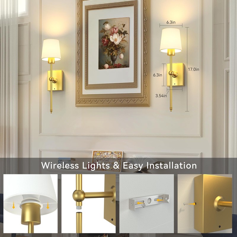 - Versatile Indoor Wall LightsThe battery wall sconces set of 2 often combine practicality with aesthetics, this gold battery operated wall lamp exudes elegance and excellence, making it suitable for a variety of areas such as bedrooms, living rooms, hallways, kitchens, bathrooms, staircases, fireplaces, TV walls, pictures. our sconces wall decor is a perfect option to elevate the indoor lighting and decoration of your home