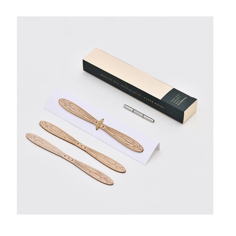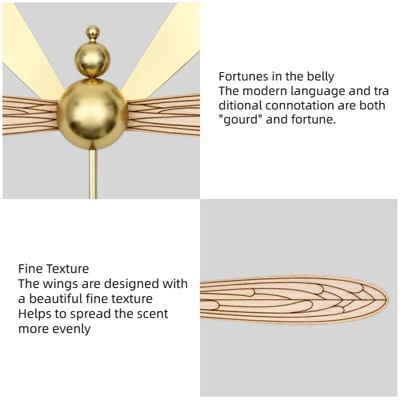 - Breathing Wood: The fragrance diffusion principle of the dragonfly is that when the essential oil is dripped from the tail, it will reach the middle sphere through the metal tube, and there are holes at the bottom of the sphere, so the essential oil will slowly seep into a piece of solid wood with a thickness of 1.8 mm for fragrance diffusion. The wood will be darker when it is infused and the fragrance will stay long after evaporation. The detailed texture of the wood wings.