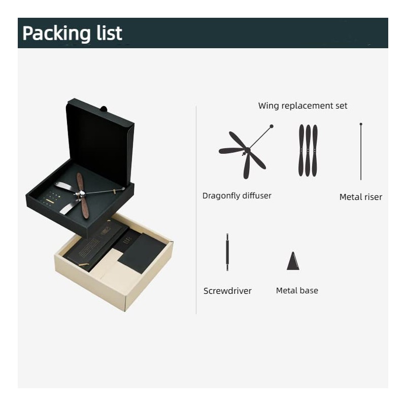 Dragonfly balance diffuser x1, solid wood wing replacement x3, metal stand x1, screwdriver x1, metal base x1