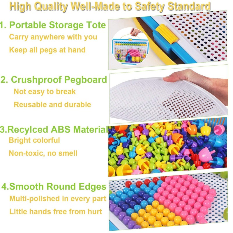 Material: ABS 296/592/888pcs mixed mushrooms nail Pegboard Size: 29*21*3.5cm It will develop kids creativity, imagination, coordinate kids hands, eyes, heads, develop kids intelligence in playing Kids can DIY many sorts of design with these colorful mushroom nails, it is amazing Package include: