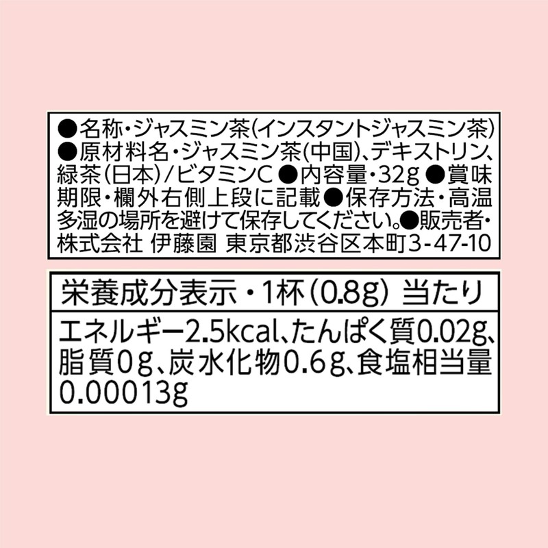 - Ingredients: Jasmine tea (China), Dextrin, Green tea (Japan), Vitamin C