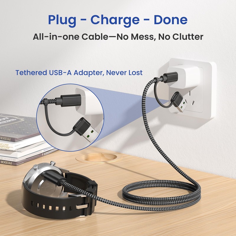 - 2-in-1 Adapter Solution: The USB-C to Garmin Charger Cable comes with a USB-C to USB-A adapter secured by a TPE strap, ensuring it won’t get lost. Works with both USB-C and USB-A ports.