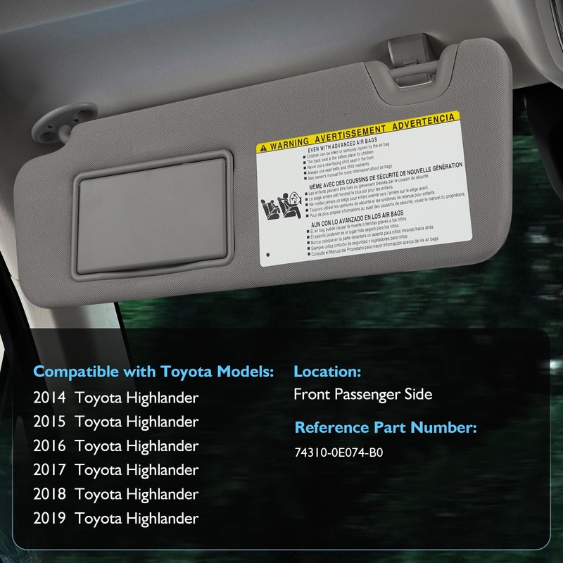 ItranMc Sun Visor Passenger Side for Toyota Highlander 2014-2019, Right Side Sunvisor with Lighted Mirror, Gray,Replacement#74310-0E074-B0