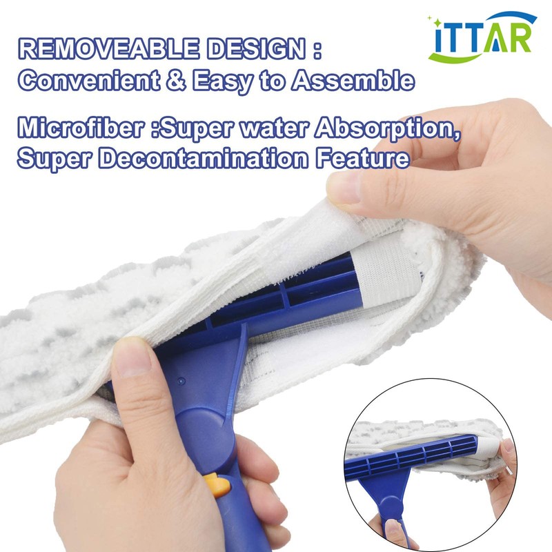 - WINDOW CLEANING KIT: 12" squeegee included for glass window or any other smooth surface. Squeegee is made of soft natural and long lasting rubber. So when using it, it will not left marks and scruffs on the window. The other one is 11" microfiber pad which has super water absorption, super decontamination feature for washing many times. Also, the microfiber pad of window squeegee has strong Velcro and it will not fall off from the T-bar.