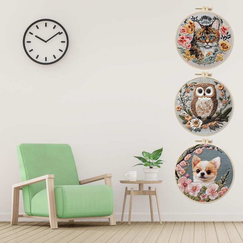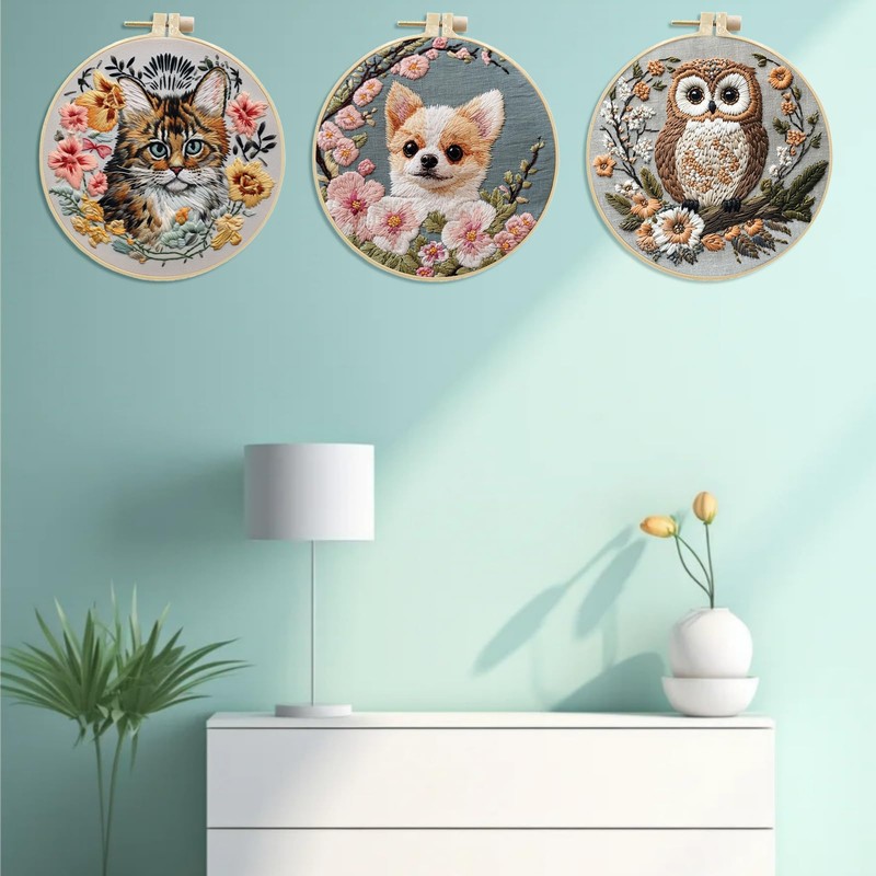 IUHUI 3 Pack Embroidery Kit for Beginners and Adults - Weird Cute Animal Pattern DIY Hand Stitched Embroidery 3 Sets with 3 Hoops (Serious Dog, Cat Owl)