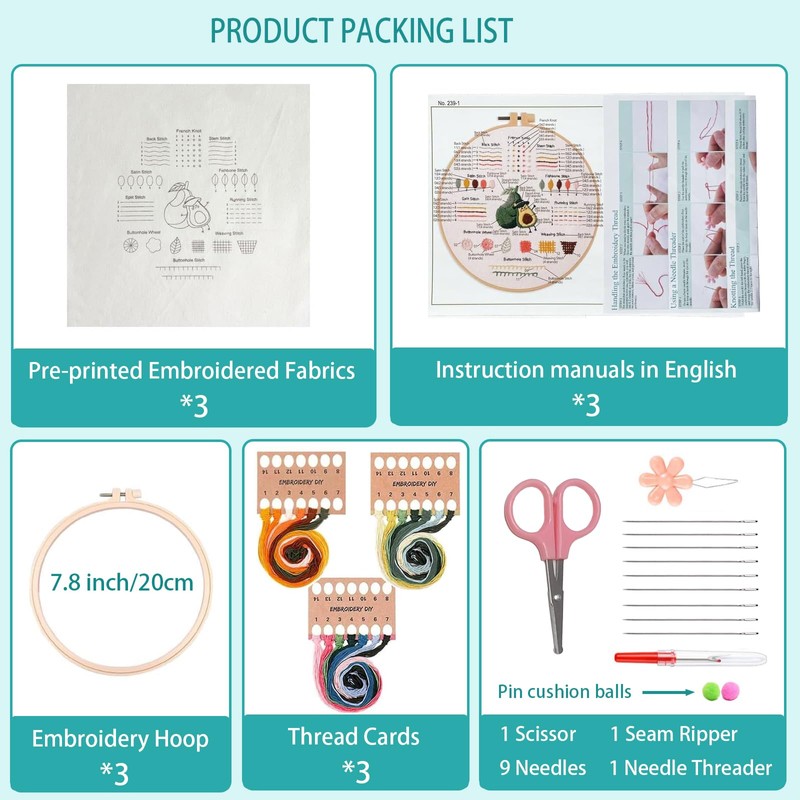 - 【Sewing Starter Kit for Needlework】 Includes 3 8" embroidered hoops, 3 printed fabric (about 12" x 12"), thread, needle, English instruction manual and other accessories tools