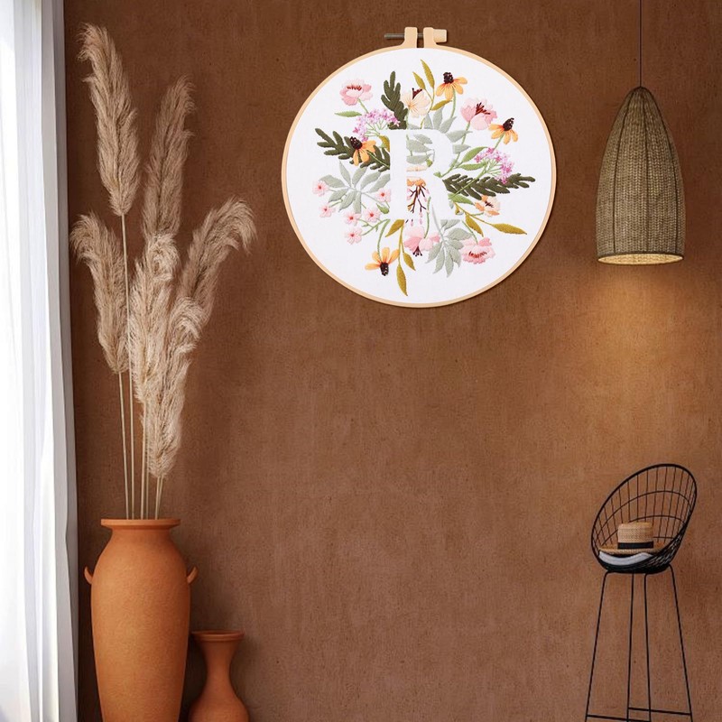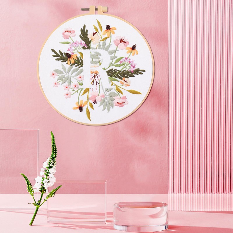 IUHUI Embroidery Kit for Beginners Adults - 26 Floral Letters Easy Patterns, DIY Hand Stitching Embroidery Set with Hoop (Flower and Grass Letter R)