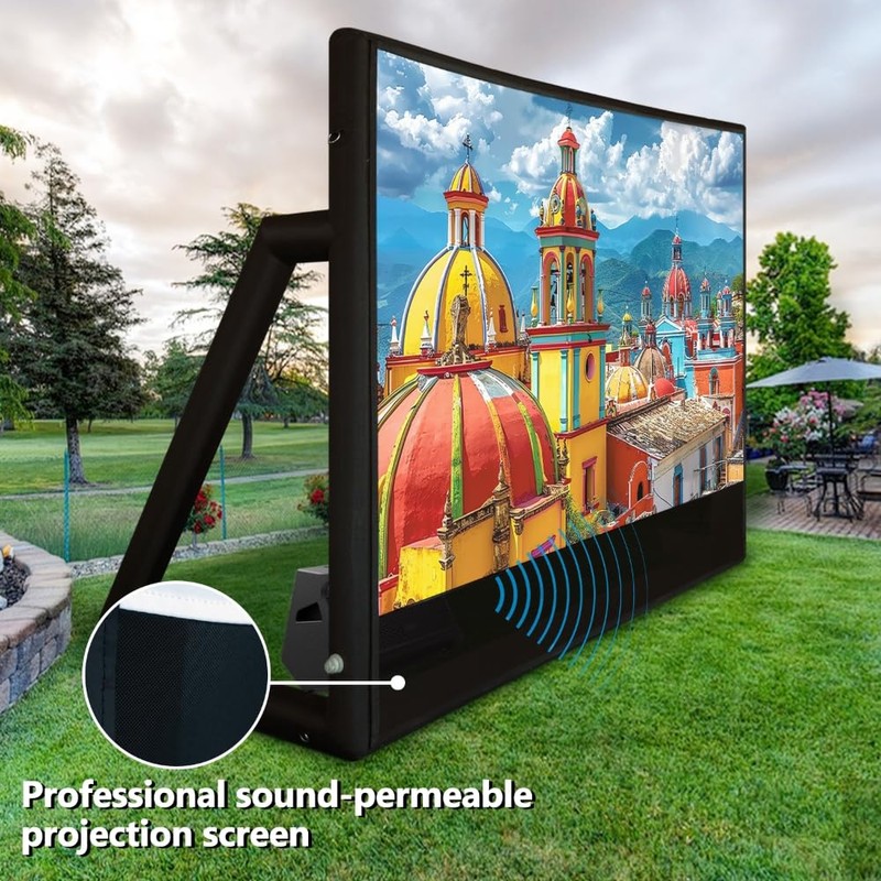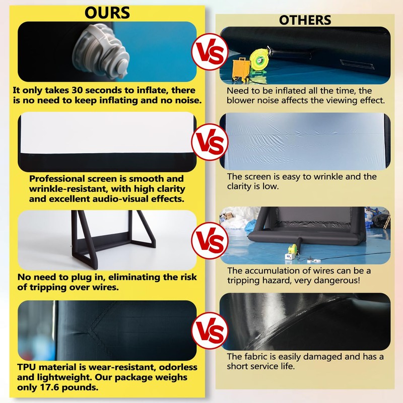 - 【Waterproof Frame & Screen】: Frame made from TPU tarpaulin with sealed air technology(No need inflate continously, No noise, flame retardant, water resistance and wear resistance); Inflatable Projection Screen is made from washable premium milk silk material that ensures a wrinkle-free experience; With our inflatable movie screen, you can share your favorite movies with friends and family in the backyard, garden, or by the pool. It's the best choice for business performance, beach party, outdoor barbecue, camping, birthday or wedding party.