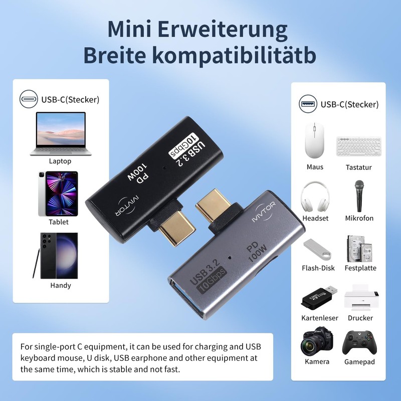 - 2 in 1 Type C OTG Adapter: our USB-C splitter has two ports, one is a Type-C port, the max. PD 100W fast charging supports and the other is a USB-A 3.2 port up to 10Gbps, which provides high data transfer. It gives your USB-C host devices the ability to connect all types of USB peripherals and charge at the same time.