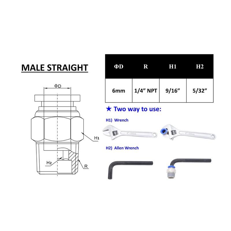 - All taper threads are pre-coated with Teflon with fine seal performance. (It may needs extra Teflon tape when thread of equipment damaged before.)