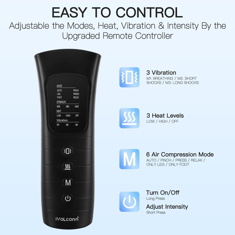 - 【AIR COMPRESSION BENEFITS & IDEAL GIFTS】- Long-term use of iVolconn leg and foot massager is conducive to shaping the perfect leg shape of women and the strong muscle lines of men, and is beneficial to relieve symptoms such as promote blood circulation, prevent muscle spasms, fatigue, swelling, varicose veins, leg restlessness syndrome, leg swelling or foot swelling. Our compression massagers are preferred by trainers. Whether you are an athlete, a driver, a nurse, a teacher, a receptionist, an office worker, a patient recovering, household woman or an old person. This leg compression massager can make great gifts for a variety of occasions, such as Christmas, Birthdays, Valentines etc.