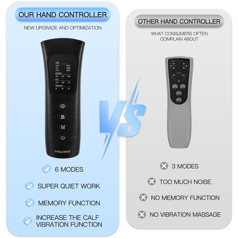 - 【ULTRA QUIET MASSAGE WITH 6 MODES】- The iVolconn leg compression massager use the upgraded intelligent urtra-quiet massage technology, vibration off max 48db, vibration open max 54db, it has 6 massage modes, 3 air pressure intensities, 2 heating levels and 3 vibration levels. Unlike others with 2 massage modes, ours leg massager with heat and compression has 6 different massage modes and 3 intensities to meet your various demands. Suitable for enjoying personalized massage. Besides, this foot massager with 2 levels of heating function to provide suitable soothing warmth for your cold feet, also calves vibration massage.