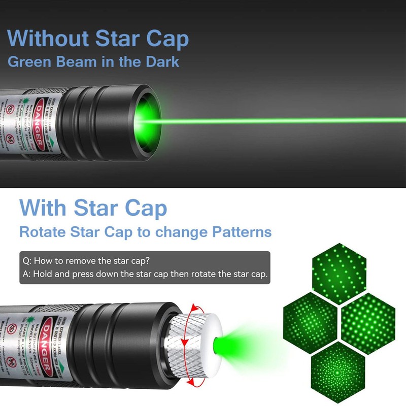 - STARLIGHT PATTERN: Press and rotate the starlight cover to remove it. In the dark, a straight red beam of light can be seen. When the starlight cover is opened, different starlight patterns can be observed.
