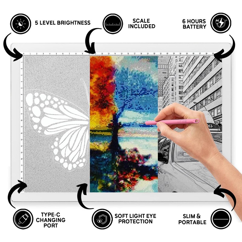 • OPTIMAL TRACING EXPERIENCE - Enjoy 5 adjustable brightness modes with soft, eye-protecting LED light for seamless tracing. Hold the button to adjust brightness, catering to your comfort and project needs.