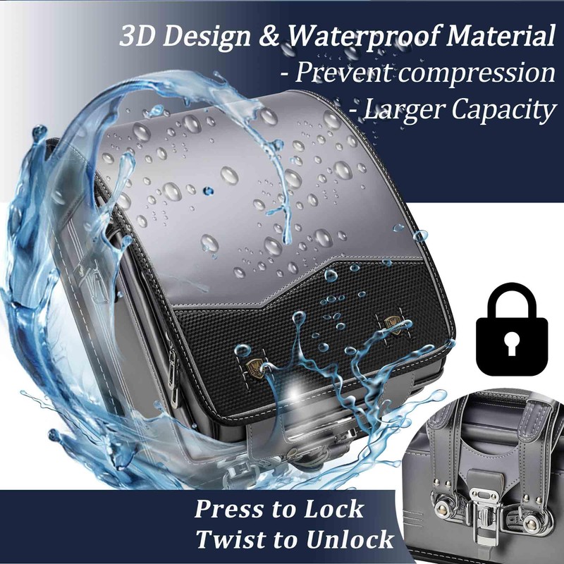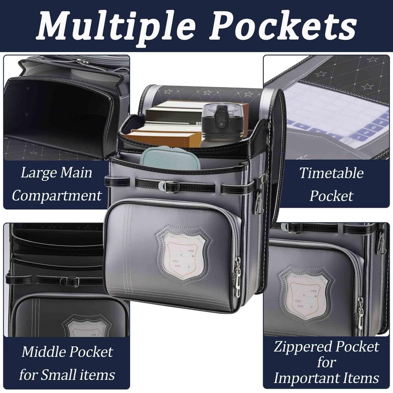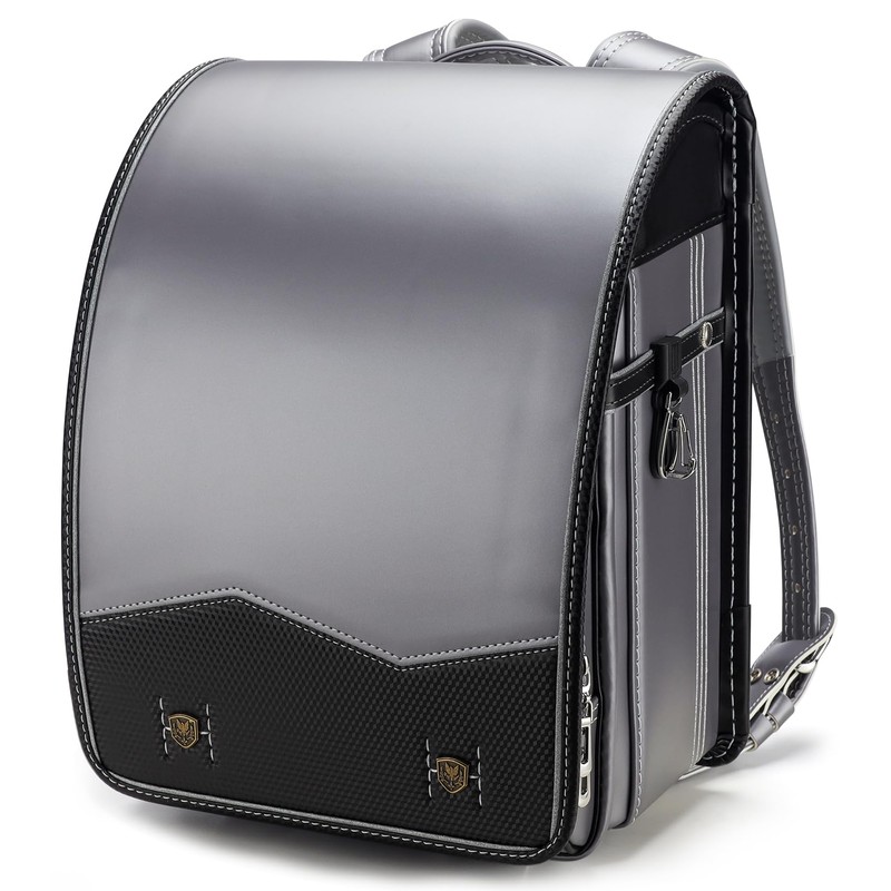 IwaiLoft Ransel Randoseru Backpack with Automatic Satchel for Boys, Japanese School Bag Embroidery PU Bookbag for Men Male (Silver&Black)