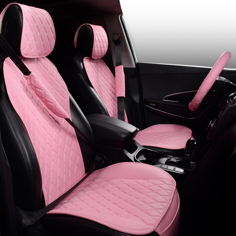 iwantit® 7 Pcs Pu Leather Car Seat Covers with 2 Front Seats, 2 Seat Belts and 1pc Steering Wheel Cover,Univeral Fit (Pink)