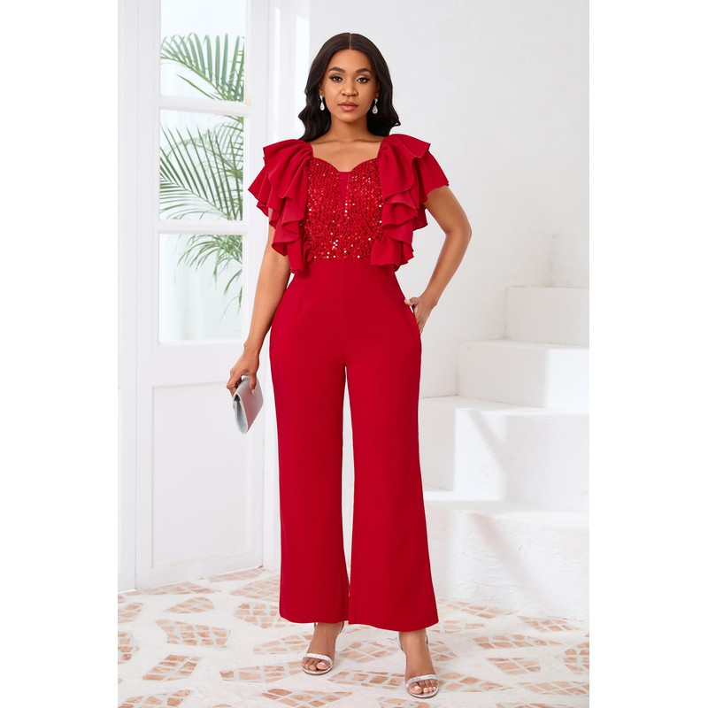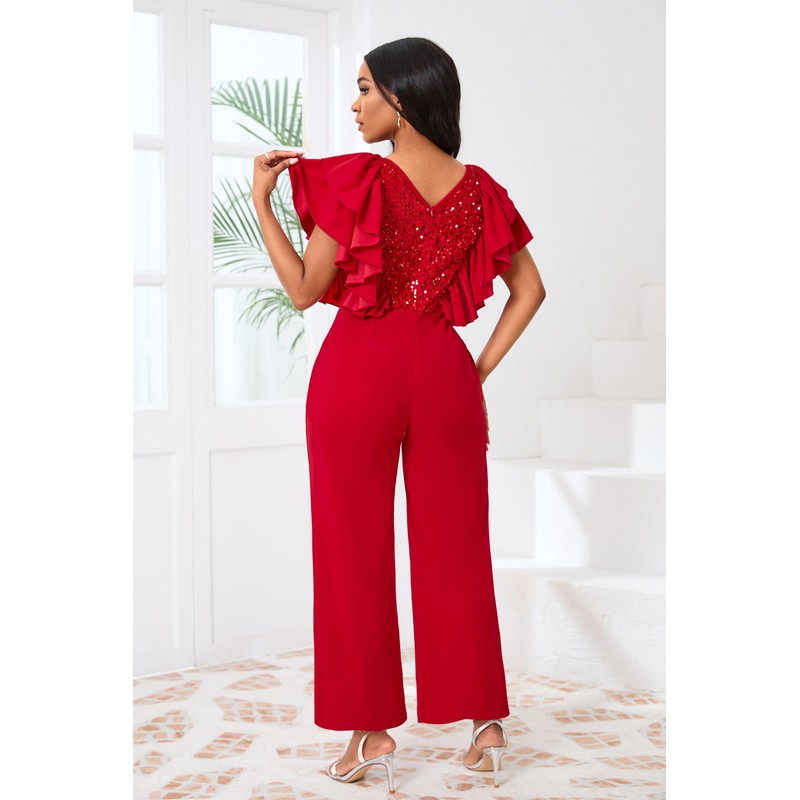 IWFEV Women's Jumpsuit Sequins Patchwork Overlay Ruffle Sleeveless Full Length V-Neck Romper with Pockets XXL Red