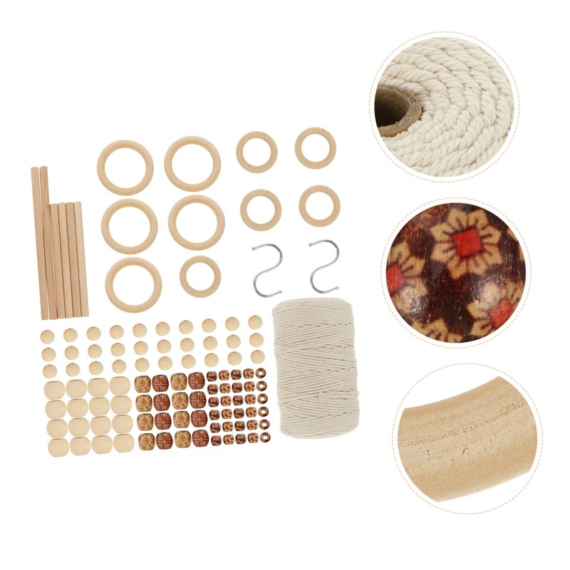 1 x Roll of 200 Cotton Rope 5 x 7cm Wooden Rings 5 x 5cm Wooden Rings 30 x 15mm wooden Beads 20 x 20mm wooden Beads 30 x 12mm Floral Pattern Beads 20 x 17mm Floral Pattern Beads 6 x Wooden Rods 2 x Hooks